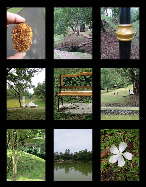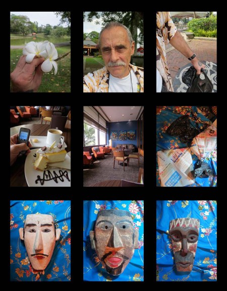 This Satuday’s journey started from MorningGlory on Jalan Bampfylde; saw Herbert walk down the hill and cross the intersection to the Japanese bunkers. From there along paths to and around the lake following the eyeline to Pullman. Thus he was drawn through Reservoir Park to the Waterfront, and the James Brooke Pavilion, lahksa, and a meander with periodic frantic bower bird behaviour at Main Bazaar traders, before going onto the Hilton for coffee and cheesecake and a teksi home to unpack and record the adventure, for the pleasure of his imaginary companion.